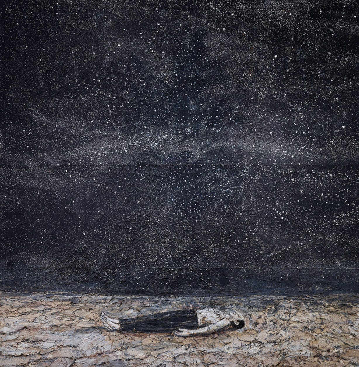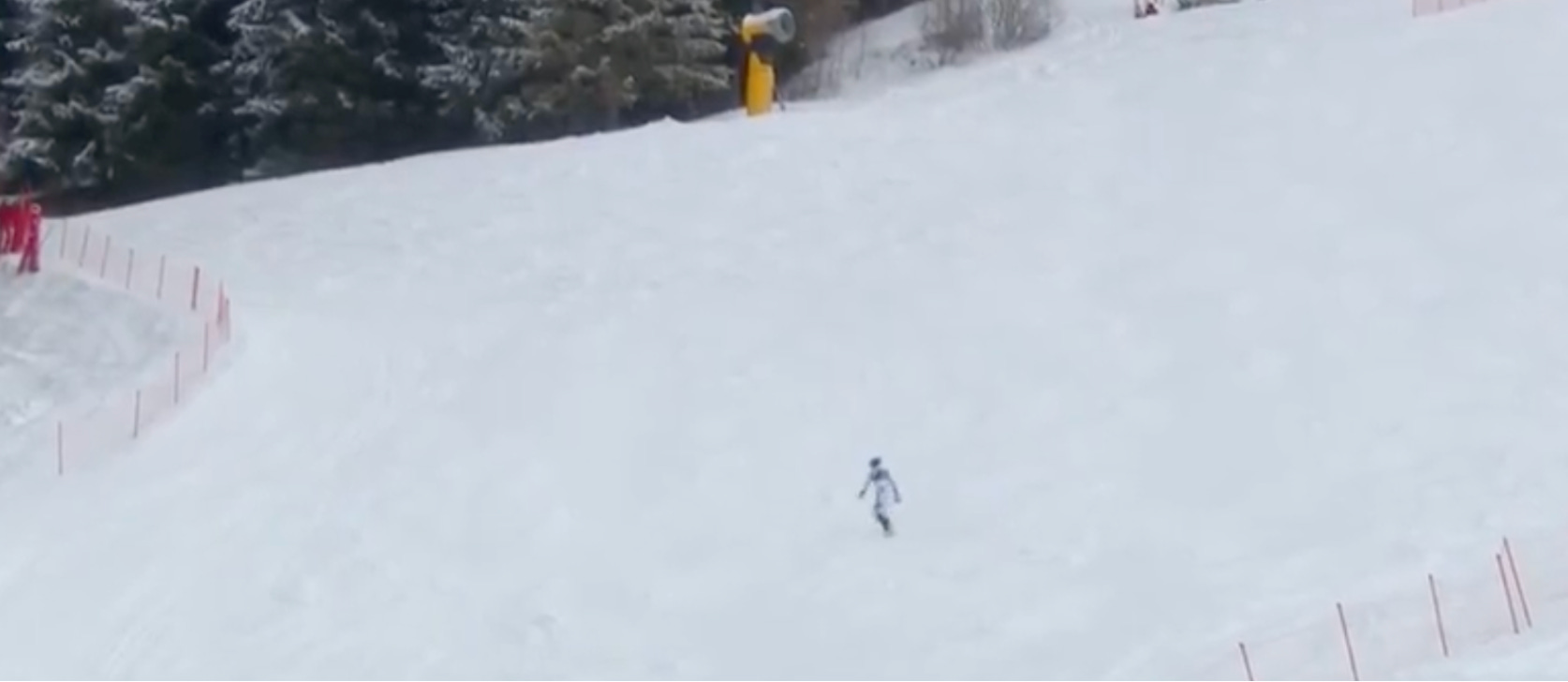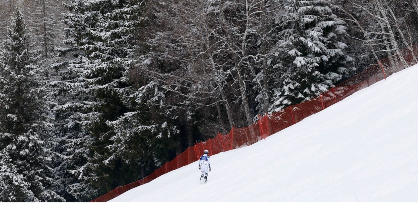 Mentre noi pensiamo questo e chissà cosa d’altro, lo sciatore continua la sua traiettoria. Cammina e cammina, senza girarsi nemmeno una volta. Forse sa che le telecamere del mondo lo stanno seguendo, forse non ci ha pensato, forse non gli interessa. Arrivato al margine del bosco la scena viene sporcata dal caso. C’è una rete rossa che sbarra il passaggio, così la camminata dell’uomo con la tuta e il casco deve interrompersi. A quel punto, quasi dispiaciuto di non poter continuare a camminare (ma forse me lo sto inventando), di poter fuggire da tutto e da tutti scomparendo fra gli alberi del bosco come aveva progettato, lo sciatore si ferma e si lascia andare di schiena nella neve. Rimane lì, immobile, orizzontale come in un quadro di Kiefer, con lo sguardo verso il cielo, come il principe Andrej che improvvisamente alla fine ha capito tutto del mondo.